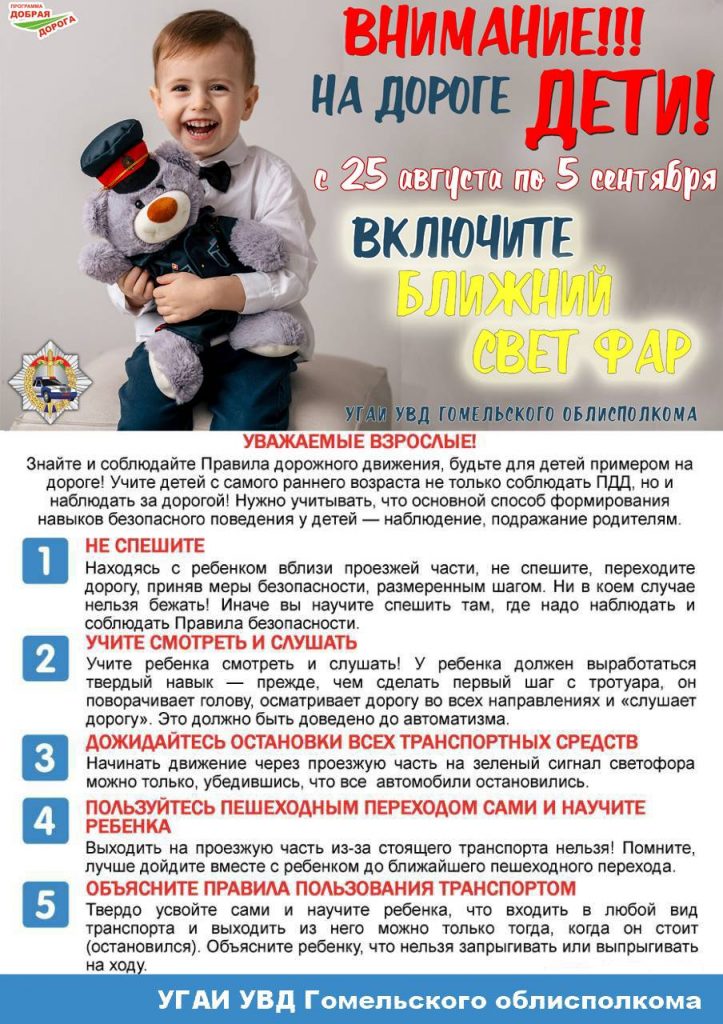 В эти дни движение транспортных средств в светлое время суток должно осуществляться с включенным ближним светом фар или дневных ходовых огней (при их наличии). За невыполнение этих требований предусмотрена административная ответственность по ч.3 статьи 18.13 КоАП Республики Беларусь в виде предупреждения или наложения штрафа в размере до трех базовых величин.− Этим мероприятием мы стараемся привлечь внимание родителей к проблеме детского травматизма и гибели на дороге. Кстати, 30 августа в преддверии нового учебного года пройдет Единый день безопасности дорожного движения под девизом «В новый учебный год — безопасных всем дорог!», — добавил Александр Ткачев.
